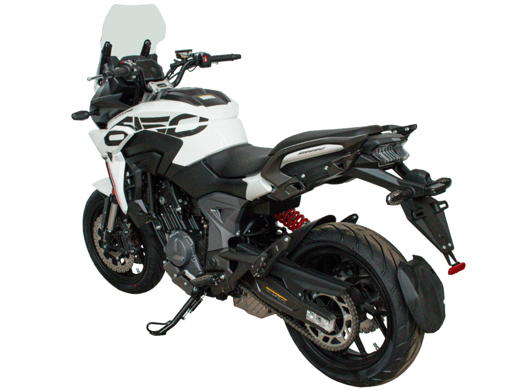 CYCLONE RX6 (SR650) – туристический эндуро для покорения самых непростых и протяжённых маршрутов. Он обладает агрессивным и современным дизайном, который выгодно выделяет его из всех остальных мотоциклов в своём классе. Мотоцикл дарит своему владельцу абсолютную свободу передвижения, позволяя долго и быстро ехать по шоссе, а при желании съезжать на такие дороги, по которым не проедет ни один дорожный мотоцикл. Небольшие габариты этого байка позволяют с успехом использовать его, как повседневный дорожный мотоцикл.Данная модель является самой крупнокубатурной в модельном ряде компании CYCLONE. Рядный двухцилиндровый четырёхтактный двигатель объёмом 650 см3 выдаёт мощность в 71 л.с. на 8500 об/мин. Максимальный крутящий момент достигается на 7000 об/мин и составляет 62 Н·м. Инжекторный впрыск топлива с блоком управления BOSCH увеличивает топливную экономичность, а также позволяет добиться высокой приёмистости и неприхотливости агрегата. Жидкостная система охлаждения не допустит перегрева двигателя даже при самом агрессивном вождении. На мотоцикл установлена 6-ступенчатая механическая коробка передач.Максимальная скорость мотоцикла составляет 180 км/ч.Модель оснащена литыми алюминиевыми дисками диаметром 17 дюймов. Колёса обуты в бескамерные покрышки от легендарной фирмы PIRELLI. С неровностями дороги эффективно справляются компоненты производства культовой японской компании KYB – телескопическая вилка перевёрнутого типа спереди и маятник с моноамортизатором сзади. Ход передней подвески составляет 130 мм, задней – 51 мм. Оба компонента подвески являются регулируемыми. Эффективное и безопасное замедление с любых скоростей обеспечивают гидравлические дисковые тормоза с двухканальной системой ABS спереди и сзади. Тормозные системы произведены известной испанской фирмой J.JUAN (входящей в легендарный холдинг BREMBO).Мотоцикл отличает хорошо продуманная компоновка с высоко расположенным радиатором. Высота 820 мм по седлу позволяет чувствовать себя комфортно даже райдерам небольшого роста. На данной модели установлена металлическая защита выхлопной системы и масляного фильтра. Под пассажирским сиденьем размещён небольшой, но крайне полезный набор инструментов.RX6 (SR650) оснащён бортовым компьютером с информативным цветным дисплеем и кнопками управления на руле, а также двумя штатными видеорегистраторами спереди и сзади. Из других приятных мелочей в допоборудовании мотоцикла стоит выделить регулируемое при помощи кнопки ветровое стекло, датчики давления в шинах, подсветку пультов, бесключевой доступ и 2 USB-порта.Клиренс мотоцикла составляет 165 мм. Объём топливного бака – 20 л. Снаряжённая масса – 245 кг.Мотоцикл сочетает в себе отличные технические характеристики, богатое оснащение, комфорт и надёжность, что позволяет вам ощутить настоящую свободу, отправившись на нём в любое путешествие.