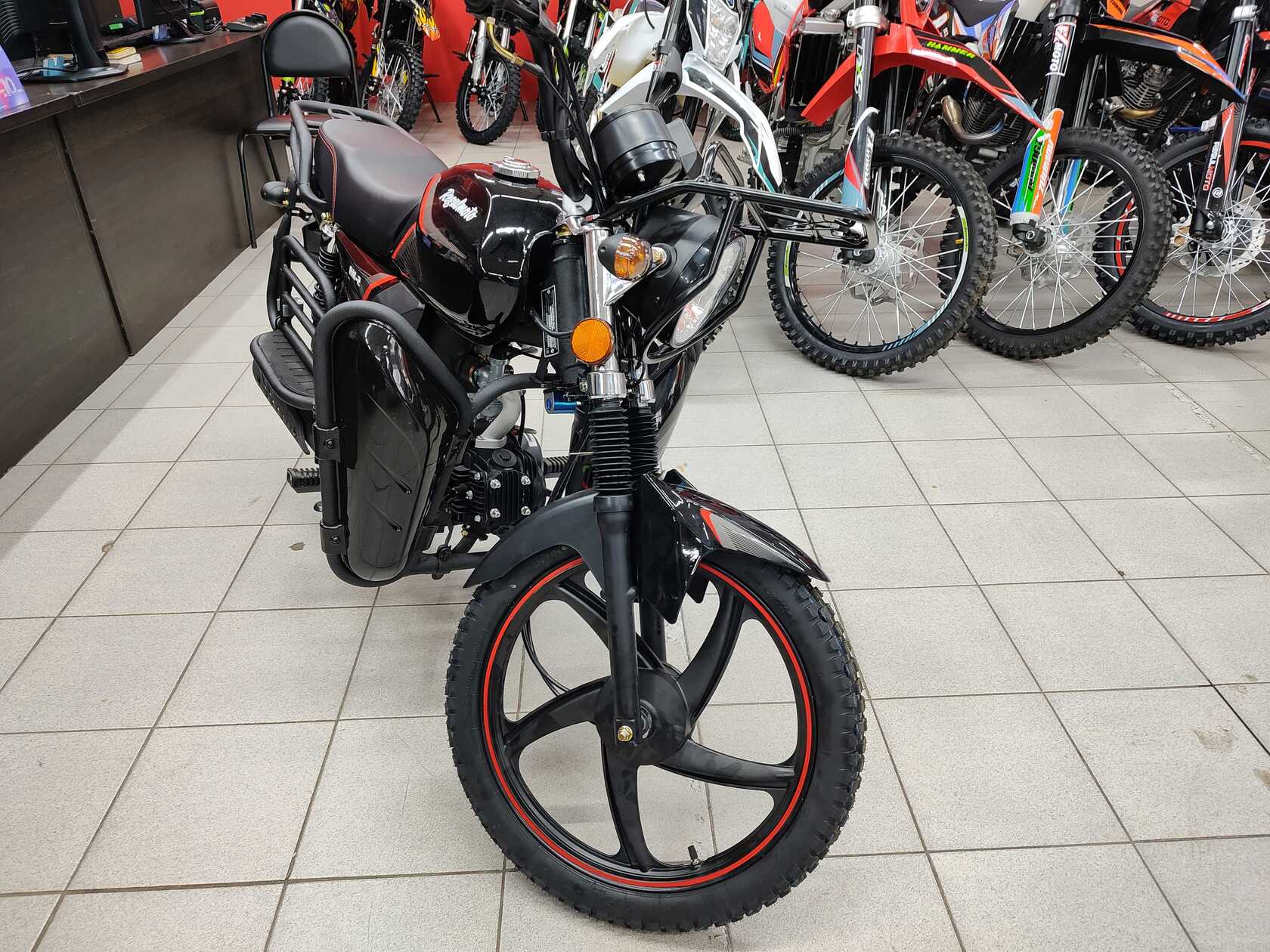 Представляем вниманию поклонников классической мототехники Regulmoto Alpha (RM-2) – обновленную версию популярного мопеда, которая отличается интересной комплектацией и расширенными возможностями повседневного использования. Данная модель отличается продуманной комплектацией, призванной повысить комфорт владельца мопеда и расширить эксплуатационный потенциал техники. Силовой агрегат – одноцилиндровый 4-тактник «кабовского» типа с увеличенным рабочим объемом. Новая ЦПГ устанавливается на производстве заводом-изготовителем и позволяет существенно поднять показатели производительности этого очень надежного и экономичного мотора. Прирост максимальной мощности двигателя также сказывается на скоростных характеристиках мопеда и удобстве управления транспортным средством.За комфорт передвижения по отечественным дорогам отвечают телескопическая вилка спереди и новые парные амортизаторы задней подвески, у которых можно настраивать жесткость пружины в зависимости от нагрузки на заднее колесо. Вопрос безопасности эксплуатации решают надежные барабанные тормоза в ступицах переднего и заднего колеса.Современный привлекательный дизайн мопеда Альфа дополняют такие актуальные решения как цельнолитые диски колес, светодиодные лампы фары головного света, а также организация дополнительного пространства для перевозки различных грузов. Последнему вопросу на Regulmoto Alpha (RM-2) уделено достаточно много внимания: сзади мопед оснащается багажным кофром и складывающимися багажными площадками, спереди над фарой закреплена багажная площадка, на защитных дугах установлены пластиковые бардачки.