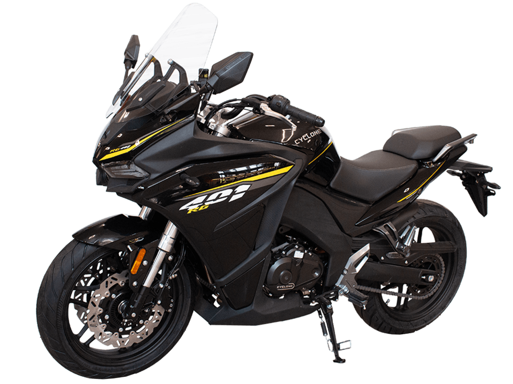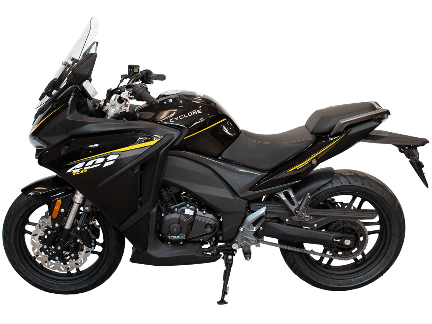 CYCLONE RG401 (SR400GS-B) – турист для покорения самых непростых и протяжённых маршрутов. Он обладает стремительным и современным дизайном в лучших “традициях жанра” туристических мотоциклов.Рядный двухцилиндровый четырёхтактный двигатель объёмом 401 см3 выдаёт 43 л.с. на 9500 об/мин. Максимальный крутящий момент достигается на 8000 об/мин и составляет 37 Н·м. Инжекторный впрыск топлива с блоком управления BOSCH увеличивает топливную экономичность, а также позволяет добиться высокой приёмистости и неприхотливости агрегата. Жидкостная система охлаждения не допустит перегрева двигателя а даже на самых непростых маршрутах. На мотоцикл установлена 6-ступенчатая механическая коробка передач.Максимальная скорость мотоцикла составляет 155 км/ч.RG401 оснащён литыми алюминиевыми дисками диаметром 17 дюймов. Колёса обуты в бескамерные покрышки TIMSUN. С неровностями дороги эффективно справляются телескопическая вилка перевёрнутого типа спереди и маятник с моноамортизатором сзади. Ход передней подвески составляет 120 мм, задней – 55 мм. Оба компонента подвески являются регулируемыми. Эффективное и безопасное замедление с любых скоростей обеспечивают гидравлические дисковые тормоза с двухканальной системой ABS спереди и сзади.Клиренс мотоцикла составляет 155 мм. Объём топливного бака – 21 л. Снаряжённая масса – 213 кг.Модель имеет два видеорегистратора, механическую регулировку ветрового стекла, датчики давления в шинах, подсветку пультов и два USB-порта. При желании можно оснастить мотоцикл двумя боковыми кофрами.Мотоцикл сочетает в себе отличные технические характеристики, комфорт и надёжность, что позволяет вам ощутить настоящую свободу на любой дороге.