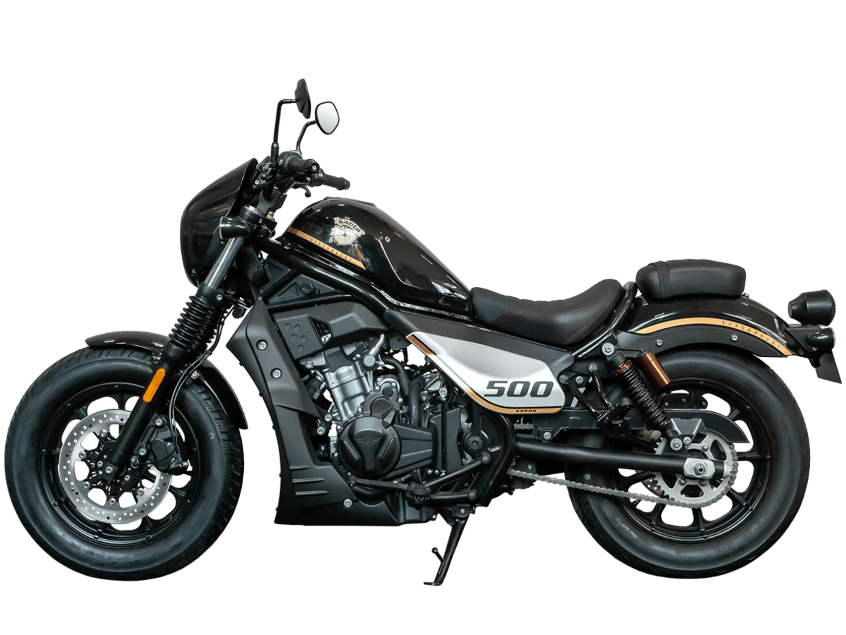 GROZA XS500 – великолепный лёгкий круизёр, идеальный как для езды по мегаполису, так и для поездок по загородным дорогам.Рядный двухцилиндровый четырёхтактный мотор объёмом 471 см3 выдаёт внушительные 48 л.с. и при высоких показателях динамики и отличном крутящем моменте способен разгонять аппарат до 160 км/ч. Инжекторный впрыск топлива с инжектором DELPHI увеличивает топливную экономичность, а также позволяет добиться высокой приёмистости и неприхотливости агрегата. Привод на ведущее колесо осуществляется с помощью цепи. Жидкостная система охлаждения не допустит перегрева мотора даже при самом агрессивном вождении.На аппарат установлена 6-ступенчатая механическая коробка передач с классической схемой “1-N-2-3-4-5-6”. Мотоцикл оснащён литыми алюминиевыми дисками диаметром 16 дюймов. С неровностями дороги эффективно справляются телескопическая вилка спереди и два газонаполненных амортизатора сзади. Задние амортизаторы являются регулируемыми, что обеспечивает лёгкую перестройку на различные режимы езды. Эффективное и безопасное замедление с любых скоростей обеспечивают гидравлические дисковые тормоза с ABS спереди и сзади.Мотоцикл имеет множество привлекательных декоративных элементов в олдскул-стилистике, что делает его похожим на кастом-байк.XS500 сочетает в себе отличные технические характеристики, комфорт и надёжность, что позволяет вам ощутить настоящую свободу на любой дороге.