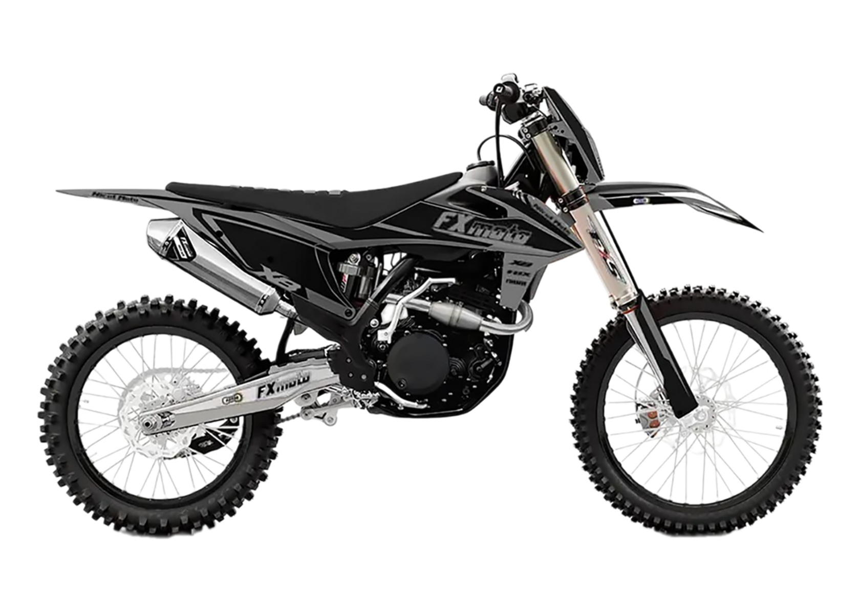 Мотоцикл FXMOTO X8 NC300 - новинка от компании FXmoto. Понравится ценителям кроссовой техники, предназначенный для покорения любых препятствий на своем пути. Рама стальная хромолибденовая, тип KTM. Глушитель алюминиевый, точная копия FMF с резонатором и выполнен из нержавеющей стали. Руль переменного сечения, усиленный. Установлена защита рук. Оснащен двигателем с жидкостным охлаждением ZONGSHEN ZS NC300S (два распредвала), шестиступенчатой коробкой передач и спортивной версией карбюратора Nibbi Racing PWK 36. 37 лошадиных сил, делают характер мотоцикла по настоящему горячим и взрывным. В FXmoto X8 учтены и устранены проблемы других производителей.Подвеска мотоцикла, полностью регулируемая, как спереди, так и сзади. Дисковые тормоза с хорошим откликом и информативностью.