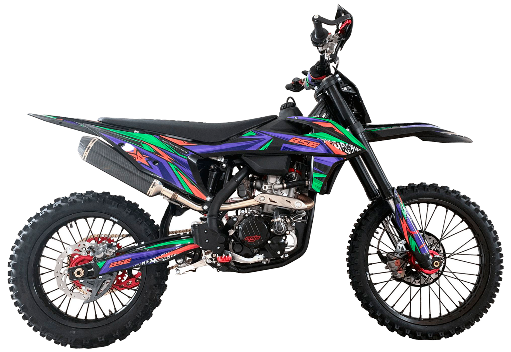 BSE RUSSIA представляет новинку 2024 – BSE T7! Ставшая уже хитом, линейка серии Т теперь включает в себя модель с двигателем Zongshen ZS174MN-5A (NB300).Двигатель T7 – мощный, технологичный и тяговитый 4-х тактный Zongshen ZS174MN-5A (NB300). Рабочий объём 300сс, 4-клапанная ГБЦ, водяное охлаждение. Минимальные вибрации благодаря наличию балансирного вала. Система питания – проверенный карбюратор Nibbi Racing PWK34. Все это позволило снять внушительные 27 л.с. при 8500 об. в мин. и 22 Нм при 7500 об. в мин. Коробка передач – механическая 6 ступенчатая, запуск – только электростартером. Мотор очень эластичный, с отличными показателями крутящего момента на низах и верхах. А легендарная надежность завода моторов ZONSEN, удобство в обслуживании и доступность запчастей в представлении не нуждается!Ещё одна особенность модели Т7 – стальная рама, которая полностью соответствует всем стандартам самого известного австрийского бренда мотоциклов для кросса и эндуро – KTM. Единая геометрия, эргономика, пропорции и углы вылета вилки. Высококачественная сталь, малый вес и большой запас прочности, идеальная развесовка. Мотоцикл оснащен легким алюминиевым подрамником, системой прогрессии и пластиковой защитой мотора. Установлен новый тип пластика, прочный, легкий и современный.Т7 доступен в двух вариантах полностью регулируемой подвески BSE Mojo Racing: Standard c передними перьями 43 мм и более профессиональной ZL Sport c передними перьями 48 мм. Подвеска с большими ходами имеет полный диапазон регулировок и помогает отрабатывать даже самые жесткие приземления, с лёгкостью "глотая" все неровности. Подвеску легко настроить под любой рельеф, любую трассу и стиль езды. Вы ощутите результат, когда будете сокращать секунды круг за кругом! Разработка подвески BSE Mojo Racing производилась опытными инженерами-подвесочниками завода, а настройка - под чутким контролем заводской спортивной китайской командой BOSUER. Особое внимание было направлено на снижение веса всей подвески. Сзади установлен полностью настраиваемый моноамортизатор BSE Mojo Racing 480 мм.На T7 установлен топливный бак на 8 л, мощная тормозная гидравлическая система с дисками диаметром 240 мм, звезды 13t – 49t, «зубастые» покрышки CHAOYANG MX880 ST. Мотоцикл оснащается полностью светодиодной фарой головного света, грипсами и ручкой газа Nibbi Racing, металлической защита рук, CNC подножками с увеличенным зацепом, цепкой шкуркой сиденья и защитой тормозных дисков под карбон.Легкий, прекрасно сбалансированный, мощный мотор. Отточенная управляемость. Подходит для новичков, а также спортсменов в дисциплинах эндуро, хард-эндуро, супер-эндуро, мотокросс.