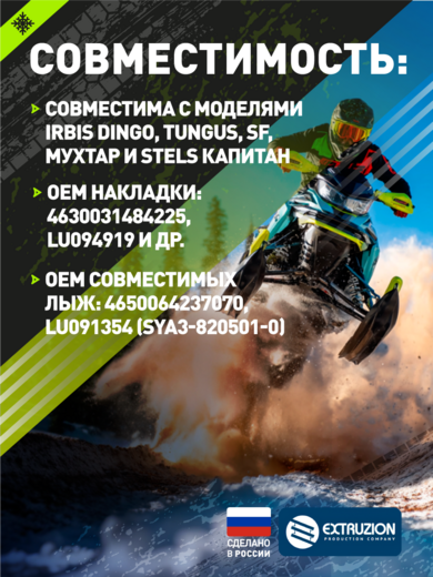 • Универсальная накладка на лыжи для снегоходов Dingo, Тунгус и других марок. Разработана для повышения проходимости и защиты стандартных лыж от износа и повреждений. Обеспечивает улучшение ходовых качеств и повышенную плавучесть в глубоком снегу.