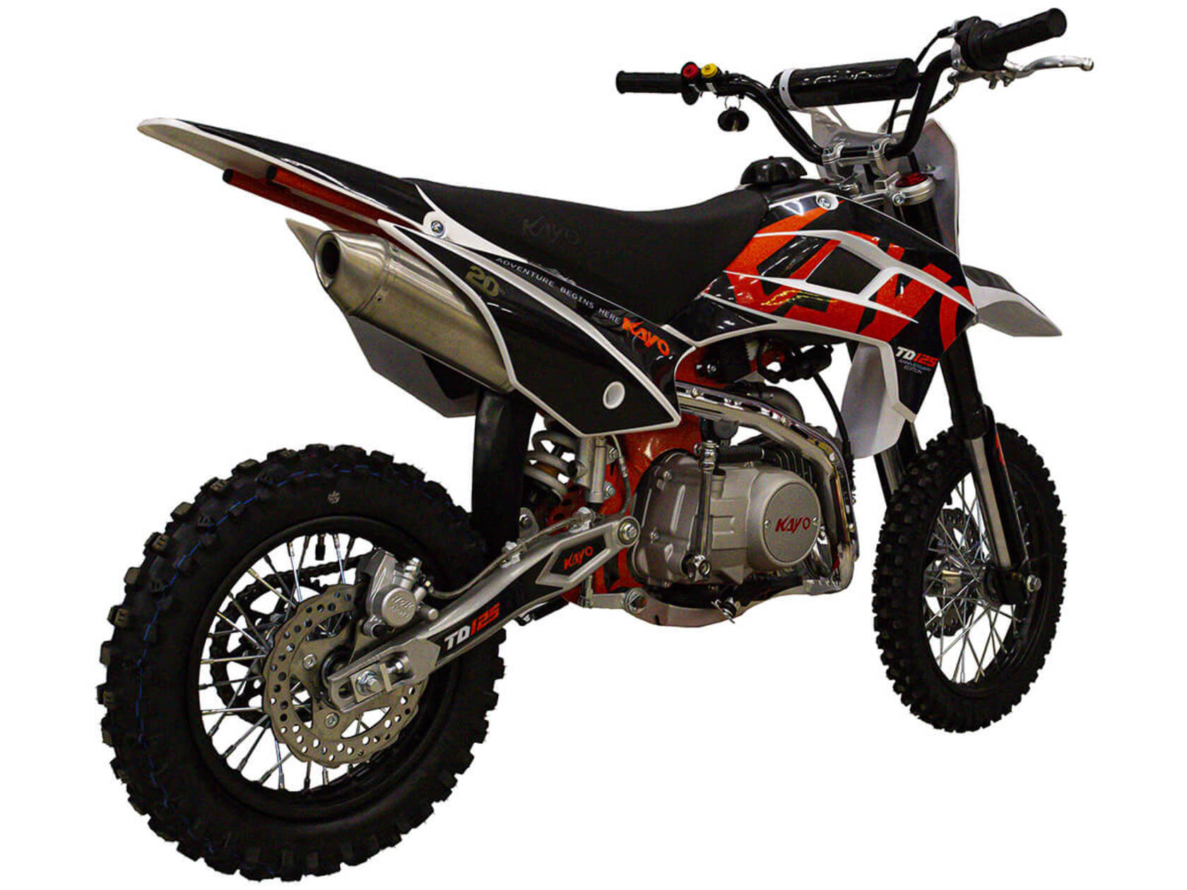 Питбайк KAYO Mini TD125 14/12 – подходящий вариант для смелых ребят от 8 лет. С ним можно научиться основам и контролю скорости на крутых спусках или сыпучих грунтах. Можно использовать и на лёгких кроссовых трассах, и на более сложных рельефах.Одноцилиндровый 4-тактный двигатель воздушного охлаждения ZONGSHEN ZS154FMI объёмом 124 см3, выдаёт 9 л.с. Карбюратор NIBBI PE19 обеспечивает бесперебойную работу техники в самых жёстких условиях эксплуатации, простоту и лёгкость в обслуживании, а также неприхотливость к качеству топлива. Питбайк оснащён полуавтоматической 4-ступенчатой коробкой передач с формулой “N-1-2-3-4”. Сцепление тут выжимать не нужно – переключение происходит под сброс газа, что позволит начинающим райдерам меньше отвлекаться и больше сосредоточиться на управлении питбайком.Аппарат имеет вес всего 65 кг и большой клиренс – 265 мм. Усиленная рама из хром-молибденового сплава и подвеска позволяют эффективно амортизировать удары при езде по неровностям и препятствиям на трассе. Передняя подвеска — телескопическая вилка перевёрнутого типа длиной 660 мм, задняя — моноамортизатор длиной 310 мм. Рама и пластик являются собственной разработкой производителя. Мотоцикл оснащён классическими стальными спицованными колёсами диаметром 14 дюймов спереди и 12 дюймов сзади. Эффективное и безопасное замедление с любых скоростей обеспечивают гидравлические дисковые тормоза марки HSK.Высококачественная износостойкая резина с развитым протектором отлично держит дорогу на различных типах покрытия. Байк оснащён системой запуска двигателя при помощи кнопки электростартера или при помощи рычага кик-стартера. Питбайк имеет вместительный топливный бак на 5,5 л, что гораздо больше, нежели у других байков этого класса.Если вы ищете послушный, компактный, шустрый, красивый питбайк для своего малыша, считайте, что вы его нашли. Это один из лучших мотоциклов для обучения и первых шагов в эндуро и мотокроссе. Он отлично подойдёт как для гонок на трассе, так и для покатушек по пересечённой местности.