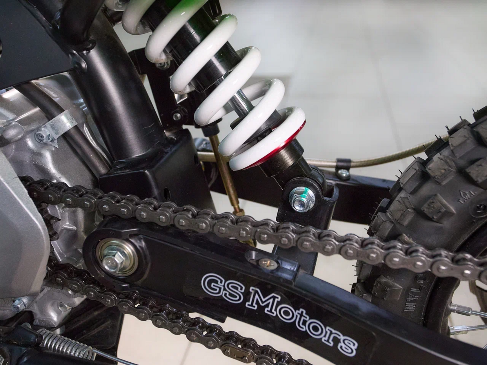 Недорогой надёжный питбайк GS Motors S7 идеален для поездок по грунтовым дорогам и бездорожью для детей которые уже научились ездить на маленьких мотоциклах объемом 50 куб.см. Хорошо чувствует себя на мягком и среднем грунте, разгоняется до 50 км/ч.Питбайк прост в управлении и не требует специального ухода, подойдёт детям до 7 лет.Передняя подвеска — телескопическая нерегулируемая вилка. Задняя подвеска маятниковая с моноамортизатором. Руль 22 мм с высоким подъёмом и перекладиной удобен для мотоциклистов разного роста.Питбайк весит всего 50 кг, при этом выдерживает вес до 60 кг. Колёса спицованные. Размер заднего и переднего колеса — 10 дюймов. Тормоза дисковые, передний тормозной суппорт двухпоршневой, задний — однопоршневой.Питбайк оснащён карбюратором с фильтром нулевого сопротивления и одноцилиндровым четырёхтактным двигателем с воздушным охлаждением. Надёжный мотор мощностью 5 л. с. и объемом 70 см³. Трансмиссия - четырехступенчатая. Система зажигания электронная (CDI), запуска двигателя - кикстартер.Питбайк относится к недорогим моделям, которые при должной эксплуатации работают без сбоев, неприхотлив в обслуживании, не занимает много места в гараже.