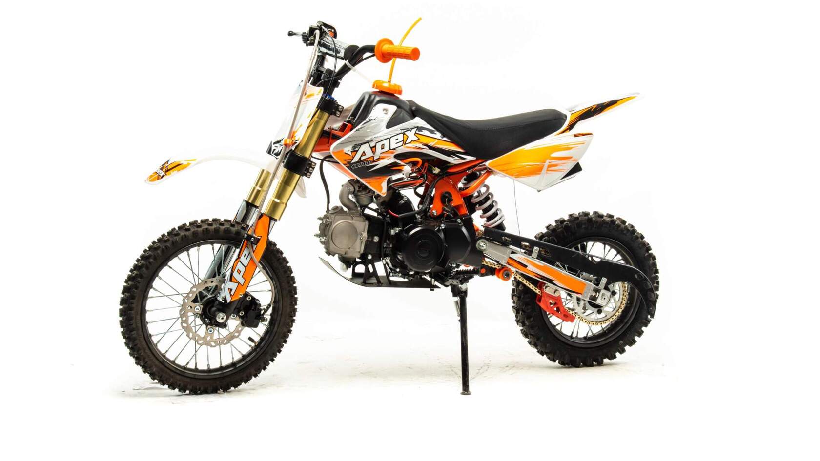 Недорогой надёжный питбайк APEX10 идеален для поездок по грунтовым дорогам и бездорожью для детей которые уже научились ездить на маленьких мотоциклах объемом 50 куб.см. Хорошо чувствует себя на мягком и среднем грунте, разгоняется до 70 км/ч. Оснащён CNC траверсами, фарой, алюминиевыми ободами, весит всего 65 кг. Питбайк прост в управлении и не требует специального ухода.