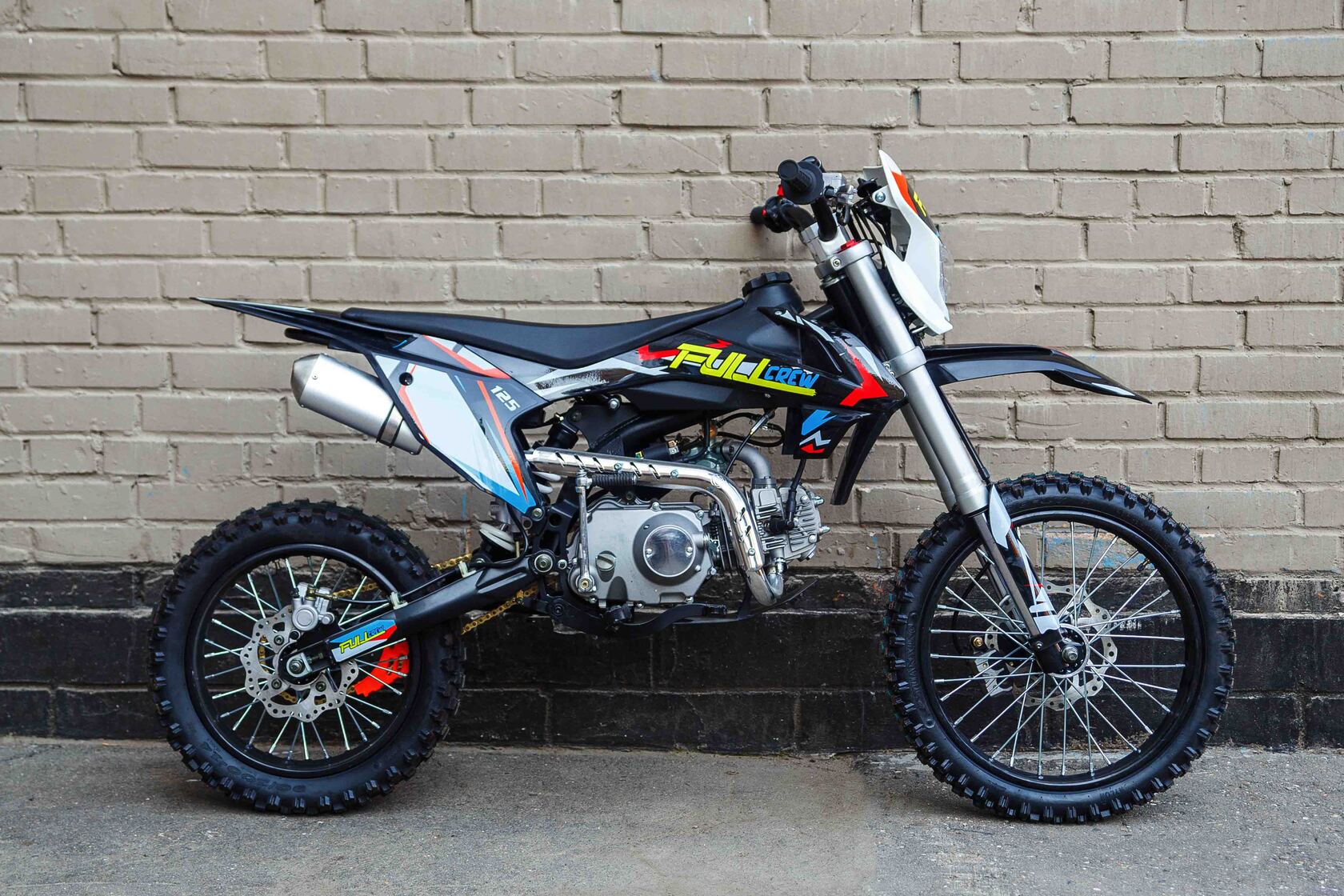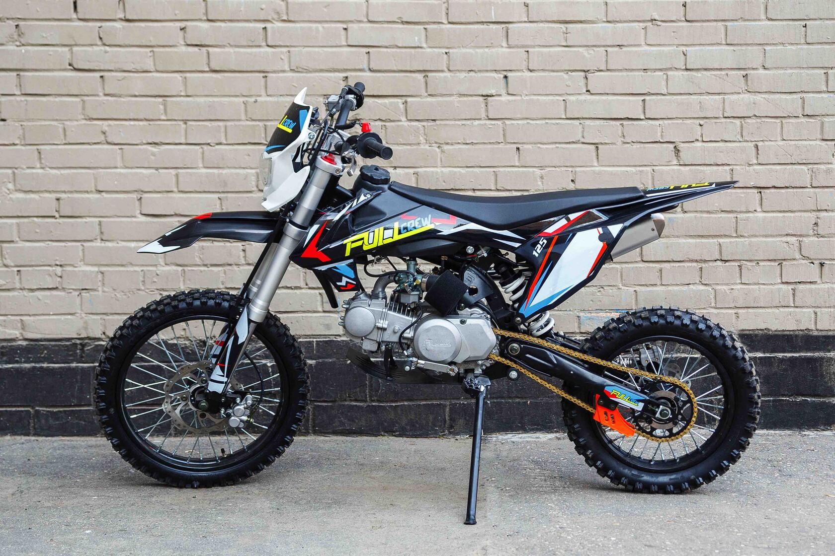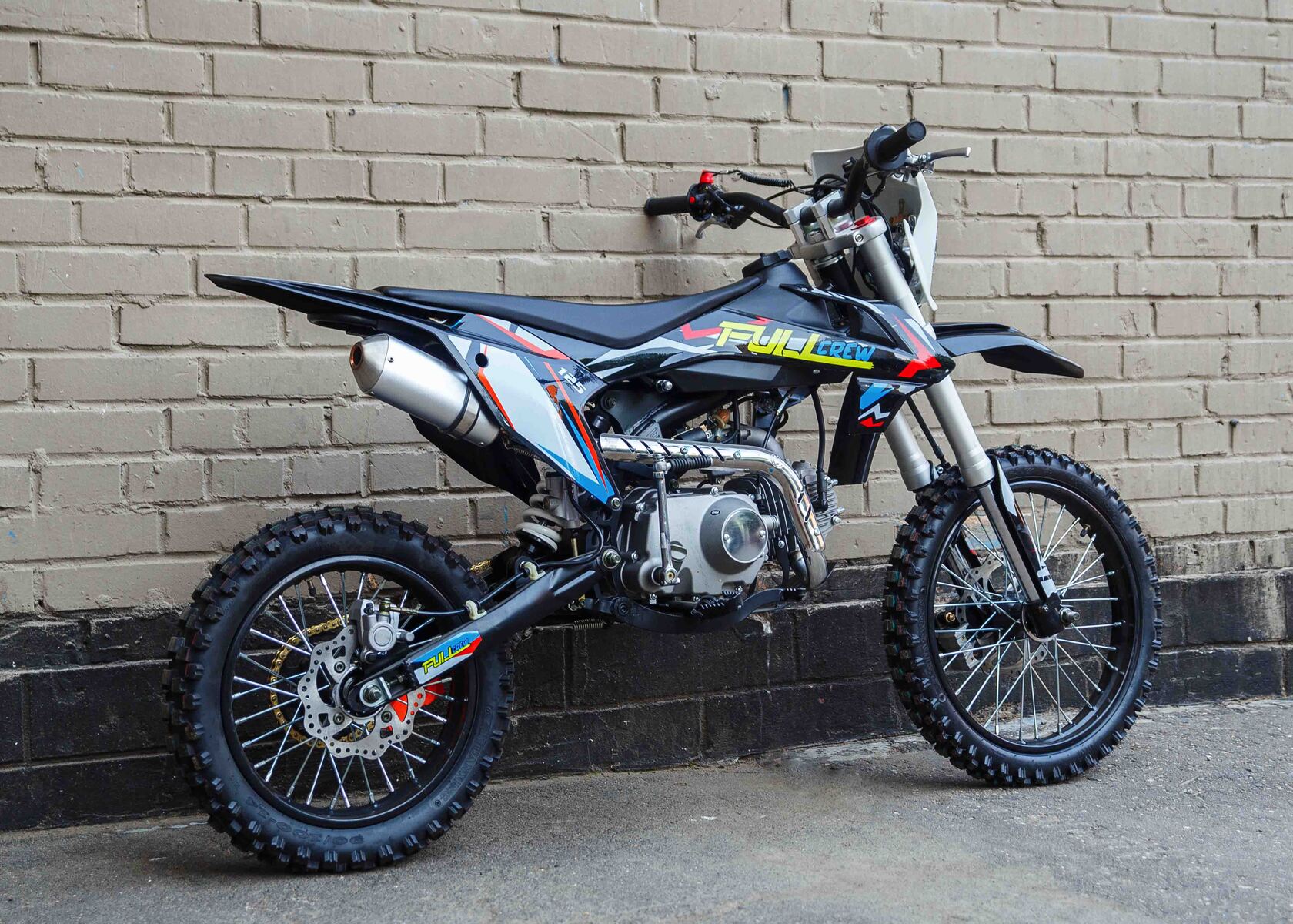 Представляем Вашему вниманию питбайк от молодого российского бренда Full Crew. Модель получила название FC125 17/14. В ней собраны все ключевые моменты для покорения сердца питбайкера. Крепкая стальная рама, дисковые гидравлические тормоза, надежный и проверенный временем двигатель YX 125 с механической четырехступенчатой коробкой передач и фара. А самый огромный плюс – это демократичная цена и наличие электростартера на питбайке Full Crew FC125 17/14.