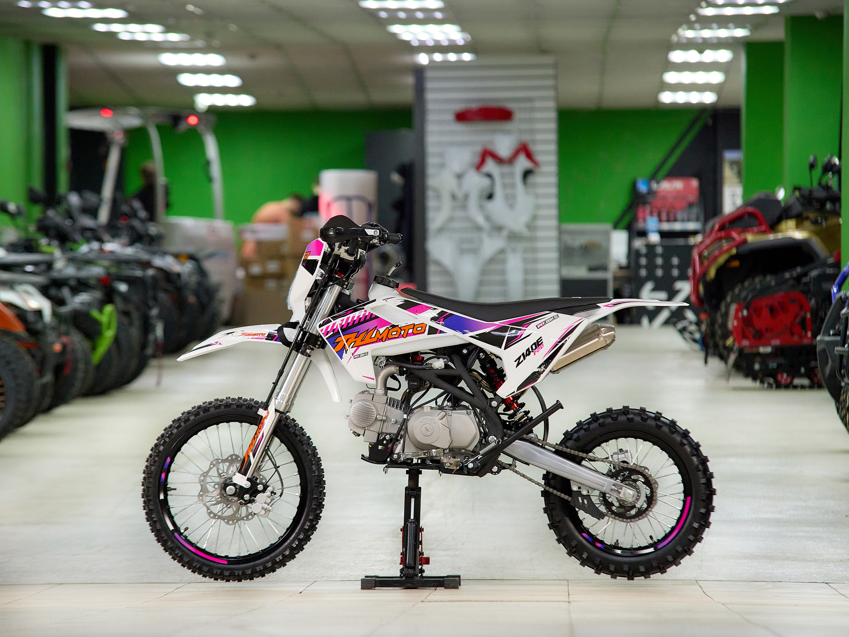 Один из самых быстрых и маневренных питбайков JHL Z140E Pro производится из качественных материалов, отличающихся прочностью и надежностью. Этот китайский кроссовый мотоцикл пользуется спросом у профессиональных мотогонщиков. Но также его за легкий вес и комфортное управление модель выбирают и любители. Основные особенности китайского кроссового питбайка Z140E ProМотоцикл спортивный JHL Z140E Pro обладает оптимальными техническими характеристиками, а также тщательно продуманным дизайном, делающим его использование удобным и сравнительно несложным. Его четырехтактный бензиновый двигатель способен быстро развивать скорость и двигаться по бездорожью до 85 км в час. Основными причинами, почему стоит купить питбайк именно этой модели, являются следующие:мощность в чуть больше одиннадцати конских сил - питбайк вытягивает там, где аналоги могут уже сдаться;прочная стальная рама, которая не боится бездорожья, падений и механических ударов;самая современная система торможения, за счет чего водитель более защищен от непредвиденных ситуаций;небольшой вес и размеры, что позволяет не только использовать его для езды, но и удобно транспортировать к месту мотогонок или буксировать при поломке, хотя китайский мотоцикл редко выходит из строя без серьезных причин;выгодная стоимость у нас, поэтому не нужно искать, где можно купить питбайк недорого.