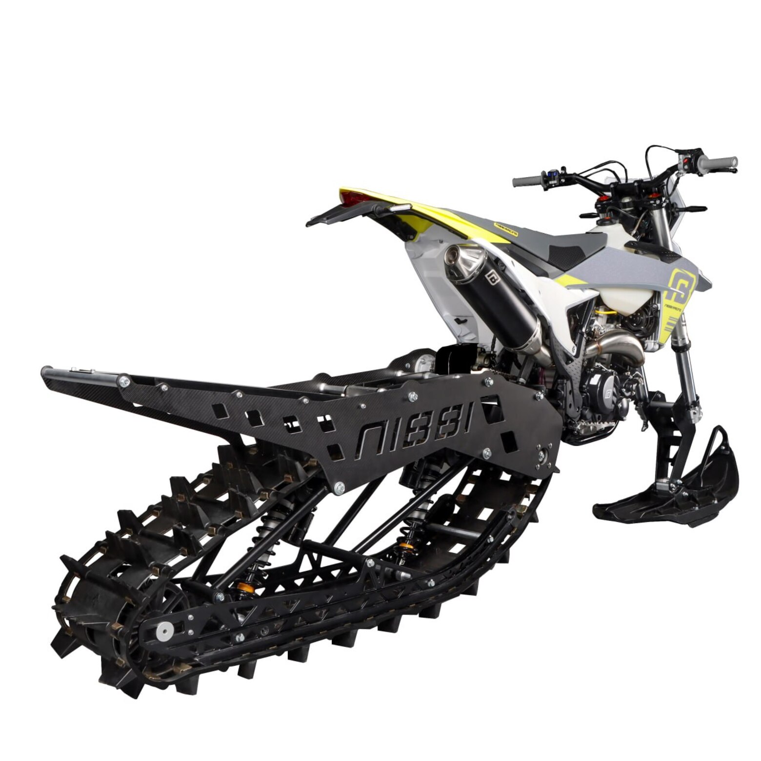 NIBBI Vanguard R-120 — это система переоборудования, которая позволяет превратить кроссовый мотоцикл в сноубайк для экстремальных зимних заездов. Комплект заменяет переднее колесо на лыжу, а заднее — на гусеницу, что открывает новые возможности для покорения снежных просторов.Ключевые преимущества и особенности:Вездеходная гусеничная система: Гусеница размером 3050 × 300 мм с грунтозацепами высотой 50 мм обеспечивает превосходное сцепление и проходимость. Комплект позволяет уверенно двигаться по снегу глубиной от 15 см и преодолевать даже глубокий рыхлый снег до 1,5–2 метров.Подвеска профессионального уровня: Стандартная подвеска R-120 оснащена премиальной технологией амортизации и полной регулировкой. Это позволяет настраивать демпфирование отбоя и сжатия в трех режимах для точного контроля в любых снежных условиях.Проверенный цепной привод: Привод инженерно разработан для максимальной надежности и использует цепь NIBBI 520 HLX2, что гарантирует стабильную передачу мощности как в глубоком снегу, так и на сложных трассах.Полная тормозная система Nibbi: Комплект оснащен собственной гоночной тормозной системой Nibbi, которая обеспечивает мощное и уверенное торможение в любых условиях.Прочная и легкая конструкция: Боковые панели из углеродного волокна снижают общий вес и повышают прочность. Все крепежные элементы заменены на высокопрочные болты с фиксатором резьбы, что исключает риск ослабления даже при экстремальных нагрузках.Технические характеристикиВ таблице ниже приведены основные технические параметры комплекта Vanguard R-120:Параметр ЗначениеРазмер гусеницы 3050 мм × 300 ммВысота грунтозацепов 50 ммШаг грунтозацепов 73 ммВес гусеничного модуля 57.45 кгТормозная система Дисковый тормоз Nibbi, однопоршневойДиаметр тормозного диска 150 ммПодвеска Два амортизатора Nibbi, с двойной регулировкой (отбой и сжатие)Задний ход подвески 85 ммПриводная цепь 520-74LЦепь в редукторе 520-52LМатериал боковых панелей Углеродное волокно (карбон)Рекомендуемый объем двигателя мотоцикла 300 куб. см и болееПрактическая информацияУстановка: Производитель позиционирует R-120 как комплект для самостоятельной установки, для чего предоставляются понятные пошаговые инструкции и видеоуроки. Однако для достижения оптимальной производительности рекомендуется обратиться к профессионалам.Обслуживание: Требуется регулярная чистка, проверка болтов и осмотр тормозов после нескольких поездок. Высокопрочная система креплений и герметичные компоненты подвески минимизируют общие затраты на обслуживание.