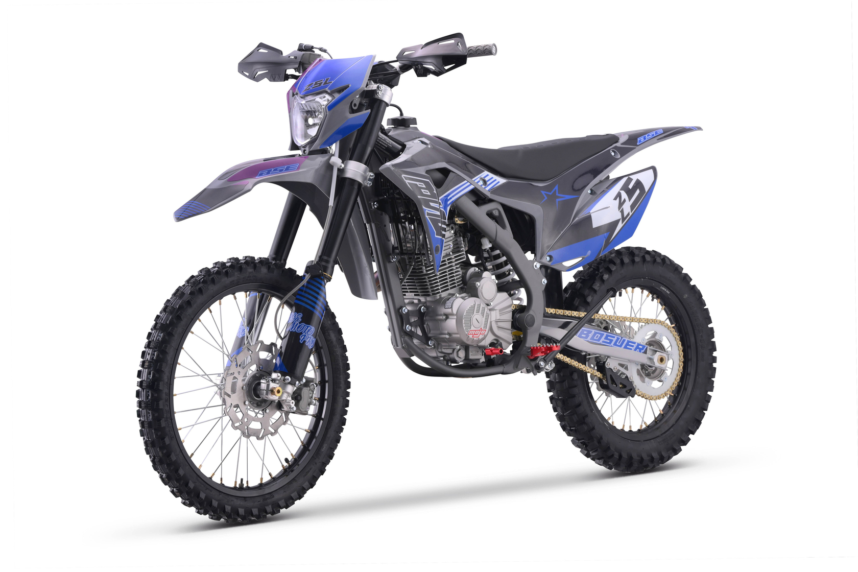 За основу мы взяли успешный полноразмерный Z5 и упростили комплектацию, чтобы сделать максимально привлекательный прайс, оставив главные компоненты — надежный 250-кубовый мотор Zonsen и усиленную стальную раму Bosuer. В итоге получили полноразмерный, функциональный и мощный эндуро мотоцикл. Идеально сбалансированный, устойчивый и готовый прощать ошибки при езде.Сердце Z5L – мощный, эластичный и надежный 250 кубовый Zonsen ZS172FMM-3A (CB250-F), 21 лс, воздушное охлаждение. Система подачи топлива – проверенный карбюратор NIBBI PWK34.Z5L уже в заводской комплектации готов к покорению серьезного бездорожья: нерегулируемая энергоемкая подвеска с большими ходами, вилка “перевертыш” и наличие рычагов задней прогрессии. Установлена “злая” внедорожная резина Carrystone. Мощная гидравлическая тормозная система HSК Racing остановит байк в любых условиях. На мотоцикле установлены: усиленные черные колёсные диски MOJO, CNC подножки c увеличенным зацепом, датчик моточасов, защита рук, грипсы и ручка газа Nibbi Racing. В фару установлена диодная лампа.Среднеразмерный Z5L подойдёт для райдеров начального и среднего уровня, которые не готовы переплачивать за более богатую комплектацию. Крепкий, надёжный и неприхотливый BSE Z5L обладает всеми качествами настоящего эндуро байка при доступной цене.