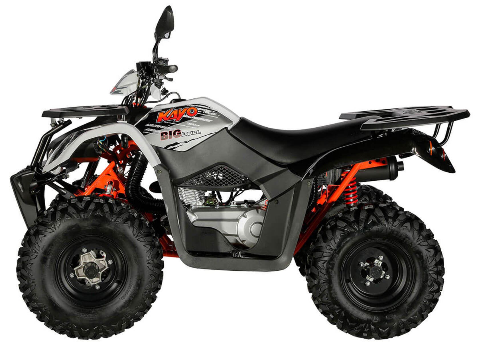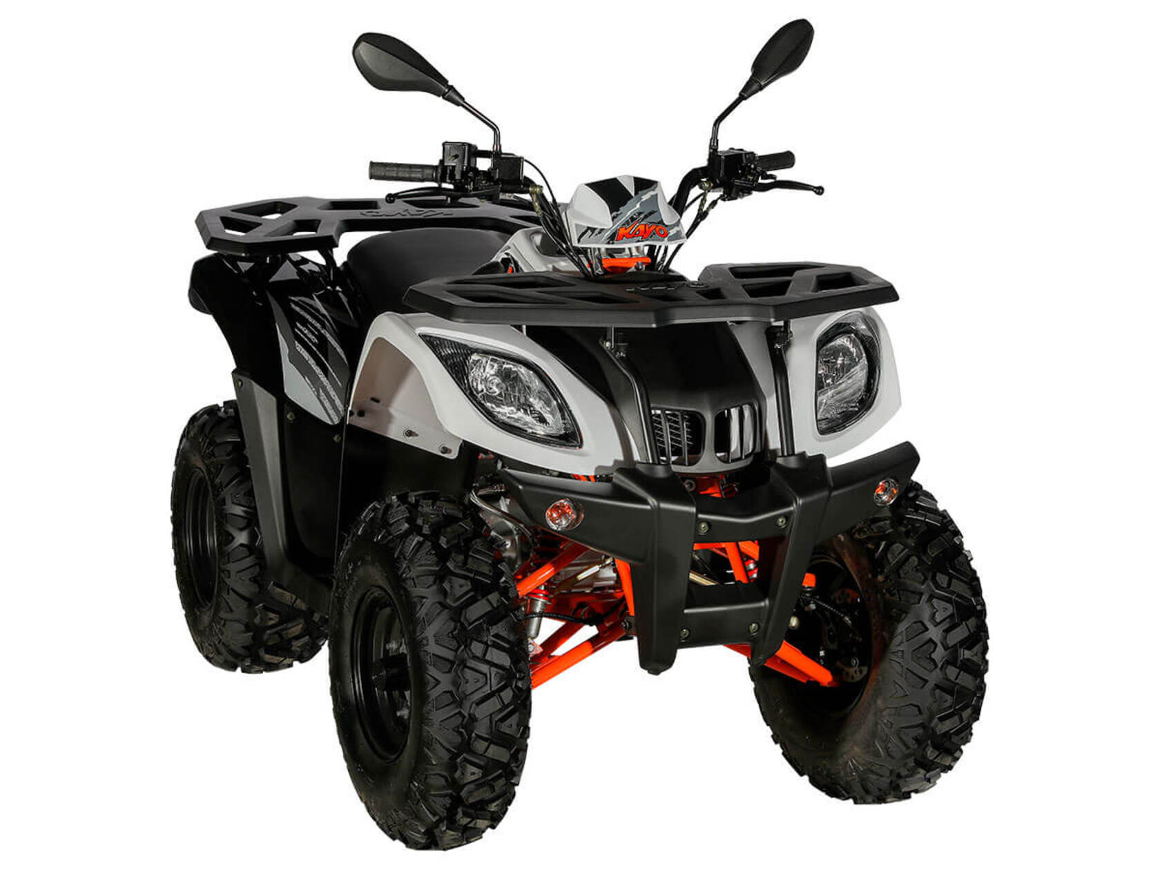 KAYO AU200 - популярная и доступная модель, которая пользуется вниманием широкого круга любителей внедорожных приключений и активного отдыха. Утилитарный мотовездеход обладает незаурядными возможностями практического использования и рассчитан на людей разного возраста и опыта.В крепкой раме, проверенной годами и тысячами пользователей, установлен 4-тактный мотор с вертикальным расположением цилиндра. Рабочий объем двигателя в 176 кубических сантиметров позволяет развивать максимальную мощность в 13 лошадиных сил. Данный мотор оснащается балансирным валом, что способствует снижению вибраций и положительно сказывается на комфорте передвижения.У KAYO AU200 используется автоматическая трансмиссия на базе вариатора. Рычаг селектора передач имеет три положения: задний ход – нейтраль – вперед. На крышке вариатора установлен шноркель, и его воздухозаборное отверстие расположено довольно высоко. Это дает возможность преодолевать небольшие водные препятствия, не опасаясь попадания воды в трансмиссию.Все кнопки управления оборудованием собраны в один компактный пульт. Здесь находятся кнопки запуска и остановки двигателя, переключатели светового оборудования, кнопка звукового сигнала. Для удобства запуска двигателя рычаг подсоса также вынесен на руль. Как и любой другой утилитарный квадроцикл, KAYO AU200 комплектуется задним и передним багажниками, сделанными из стальных труб и облицованных пластиком.