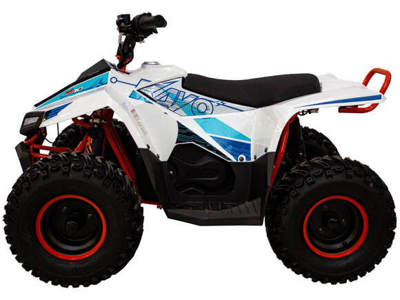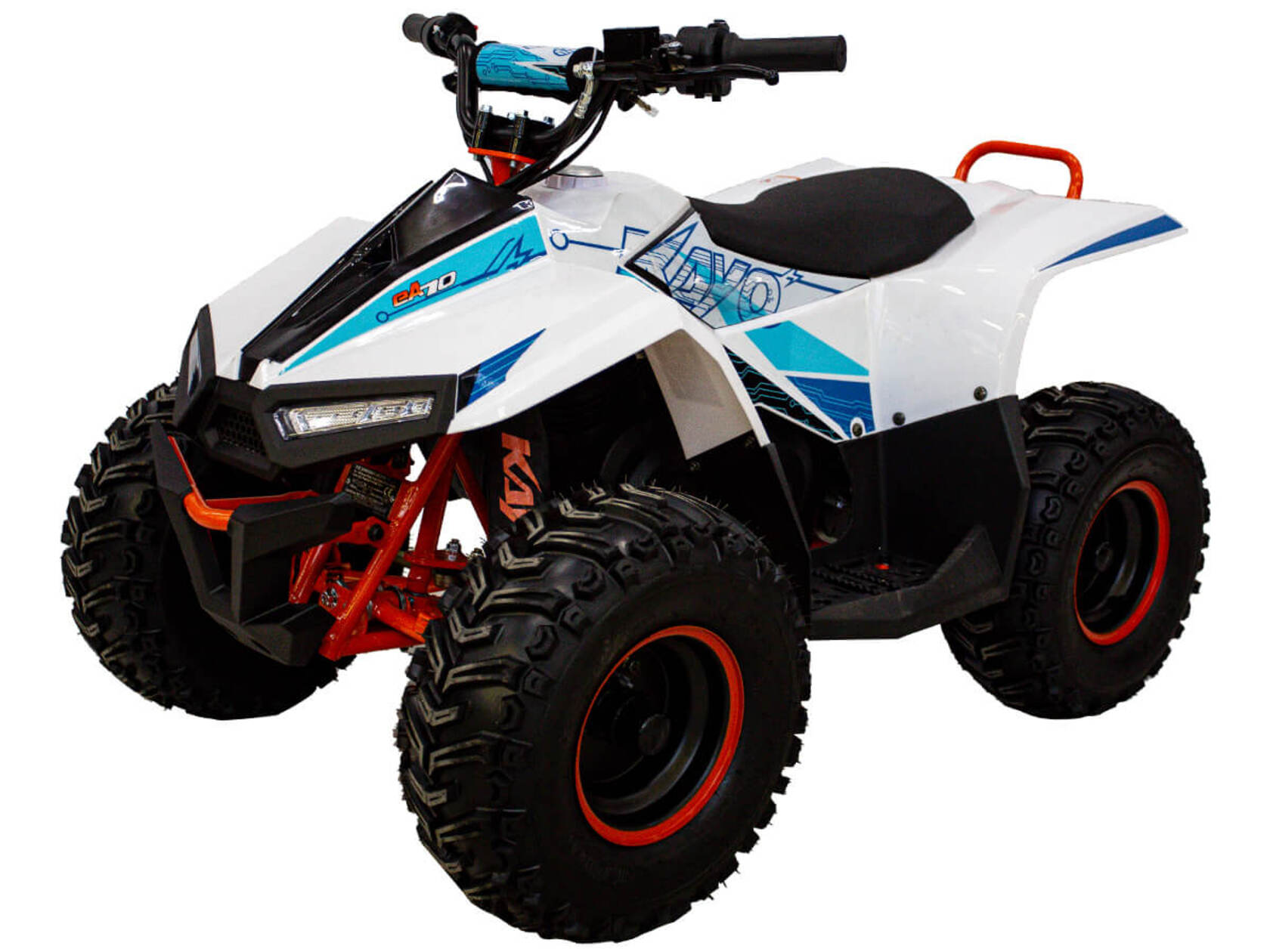 Квадроцикл KAYO EA70 – мощная внедорожная техника для весёлых и безопасных заездов на природе. Подходит для детей от 4 до 8 лет.Оснащён бесщёточным электродвигателем мощностью 500 Вт. Обеспечивает плавную и бесшумную езду без выхлопных газов. Свинцово-кислотный аккумулятор 48V20AH обеспечивает запас хода 50 км. Полная зарядка аккумулятора занимает около 8 часов. Трансмиссия представлена 3-ступенчатой коробкой с реверсом. Квадроцикл имеет систему плавного ускорения и торможения, что обеспечивает комфорт и безопасность во время заездов. Имеется регулируемый ограничитель максимальной скорости. Грузоподъёмность квадроцикла 50 кг.Диаметр колёс 7 дюймов. Подвеска спереди представлена нерегулируемым амортизатором длиной 250 мм, а сзади – регулируемым амортизатором длиной 235 мм. Сзади установлен гидравлические дисковые тормоза.Приборная панель представлена электронным дисплеем, куда выводится информация о скорости, заряде аккумулятора и километраже.Габариты квадроцикла 1250х780х820 мм, вес 93 кг.Внимание: поставляется в разобранном виде. Предназначен для самостоятельной сборки.