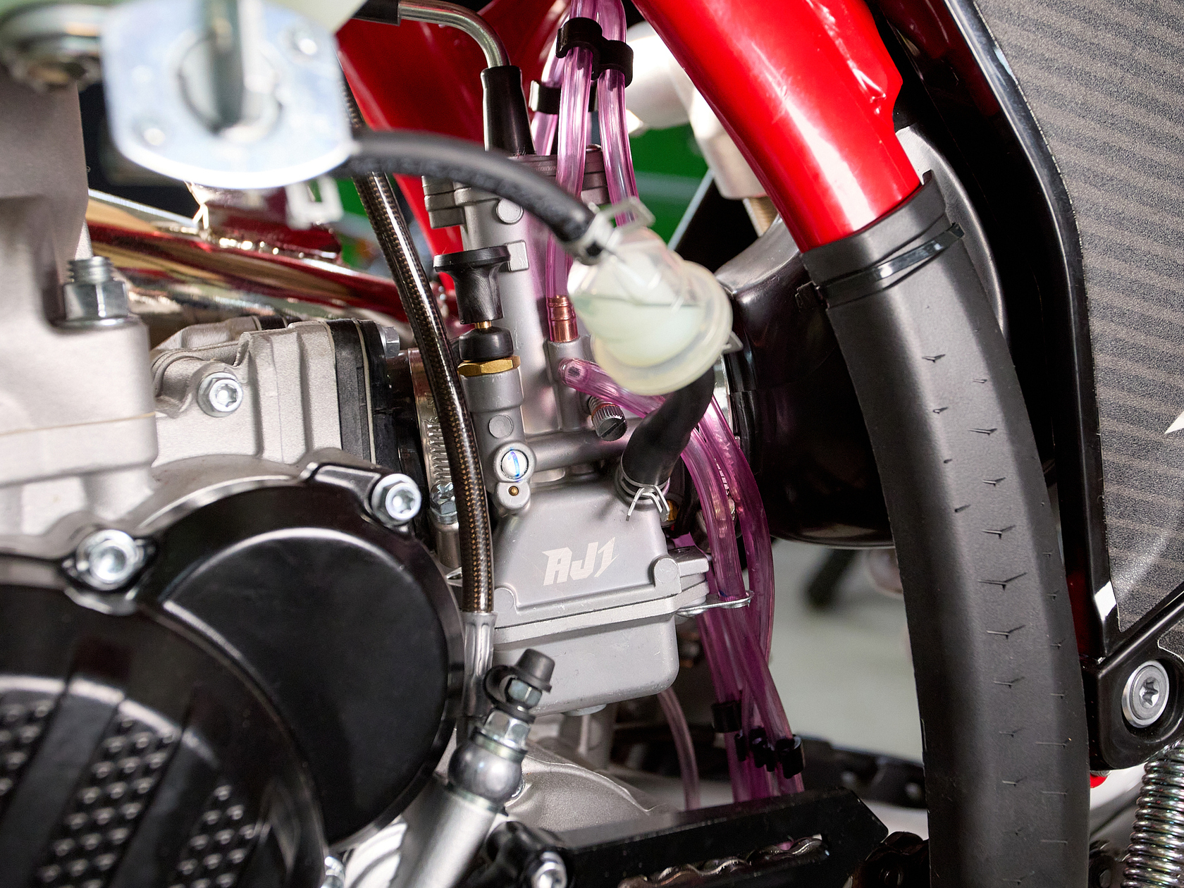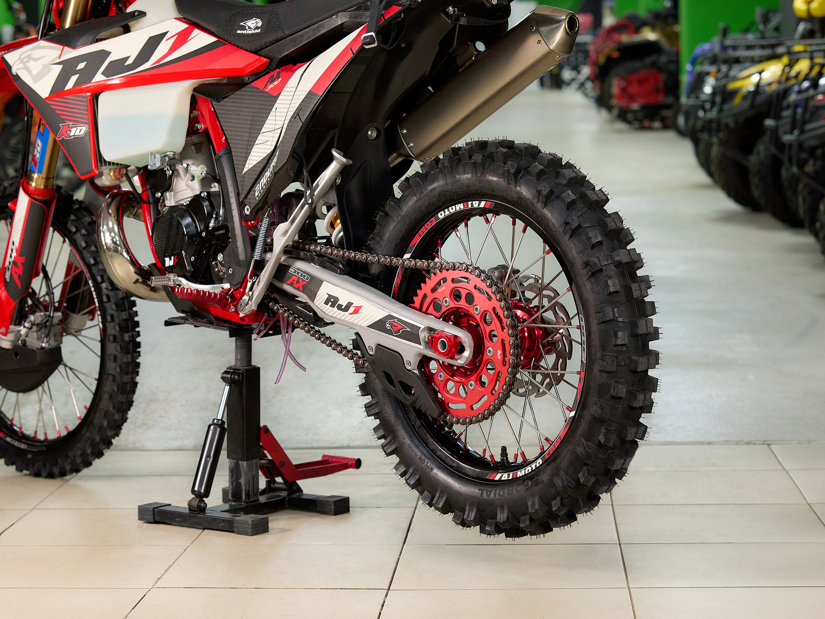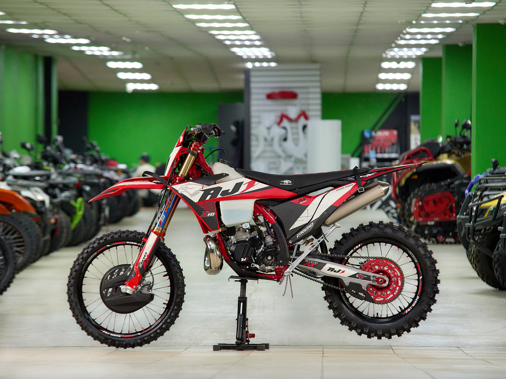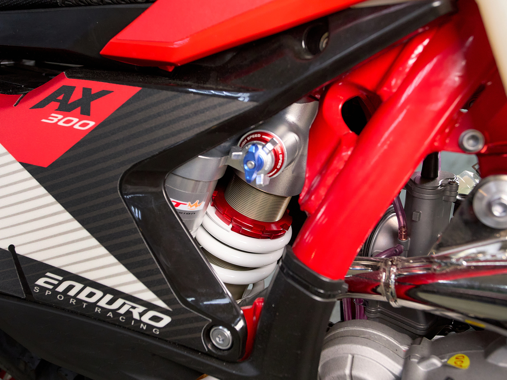 Подробнее о AX300Модифицированная подвеска разработанная AJ1 совместно с HTW, регулировать которую можно теперь без применения инструментов, «на ходу». Двухкамерная передняя вилка с закрытым картриджем (DCC) серии AJ1-T10 с диаметром пера 48 мм и длиной 940 мм, в которой используются двукомпонентные сальники SKF Италия, а также высококачественные направляющие от японской фирмы DID ЯпонияМоноамортизатором HTW T10 регулировка без инструмента с системой PDSНовые фрезерованные траверсы со всеми регулировками а также руль переменного сечением из высокопрочного алюминиевого сплава марки 7075-T6.Новая запатентованная конструкция воздушного фильтра AJ1-Pro Red. Предварительно пропитанный смазкой - фильтр специально создан для обеспечения максимального потока воздуха, сделанный из негорючего материала.Новые радиаторы и дефлекторы воздуха позволили повысить набегающий поток и улучшить охлаждение при движении.Широкие фрезерованные подножки AJ1 из алюминиевого сплава, со сменными шипами из нержавеющей стали.Обода из алюминия 7050-T6 в стандартной комплектации имеют подшипники NSK, 4-мм спицы из нержавеющей стали и алюминиевыми ниппелями в сочетании с новыми шинами AJ1 soft compound обеспечивает постоянное сцепления колес в разных дорожных условиях.Размер колес: перед – 80/100-21 зад – 120/100-18Новый алюминиевый маятник без прогрессии + направлющими с низким коэффициентом трения обеспечивает лучший контроль и экономию веса, необходимую на треке и в горах.Запатентованная тормозная система AJ1 зарекомендовавшая себя, как лучшая в классе, великолепно работающая с тормозными дисками нового дизайн и синтетическими спеченными тормозными колодками Elig Тайвань. Спереди установлен двухпоршневой суппорт AJ1 в сочетании с диском диаметром 260 мм. Сзади – однопоршневой суппорт с диском диметром 220 ммВ стандартную комплектацию входит новая алюминиевая складывающаяся боковая подставку нового дизайна, а также фирменное сиденье AJ1Anti Skid, выполненным из нескользящего материала со специальными прорезиненными вставками.Ведомая звезда AJ1 520 на 52 зубаВыхлопная титановая система AJ1 с Power Bomb и DB-Killer (съёмный) легче на 1 кг предыдущих выхлопных систем от AJ1.