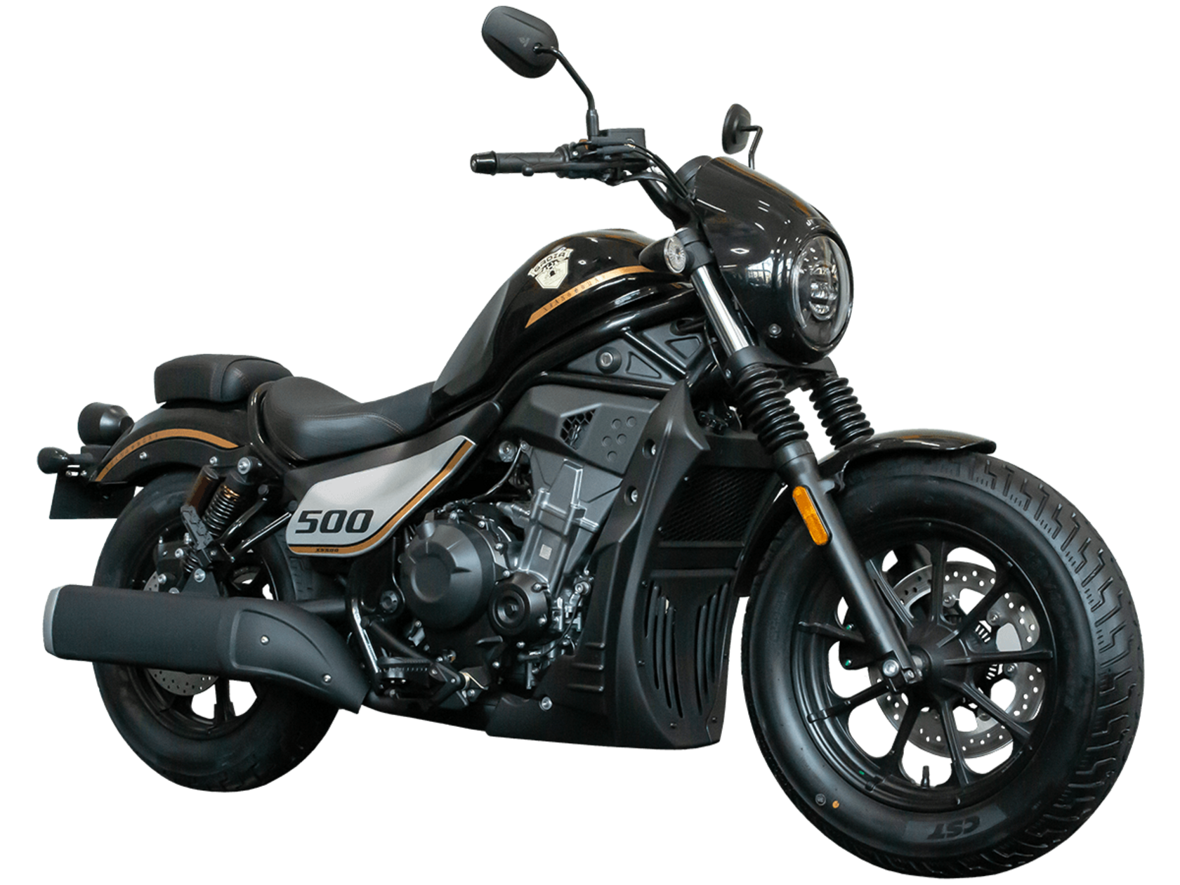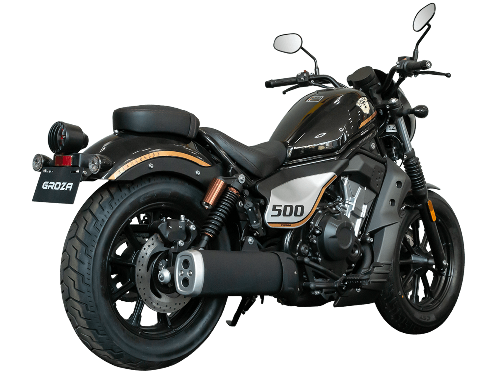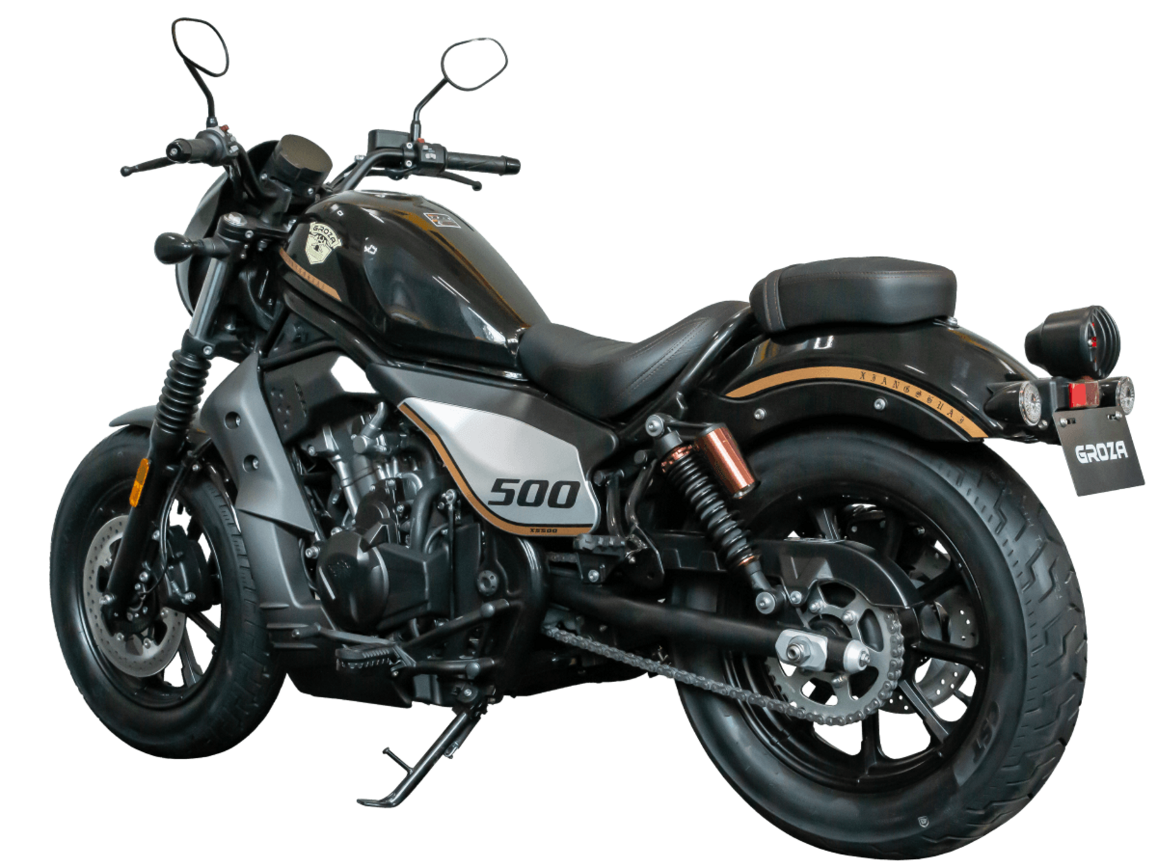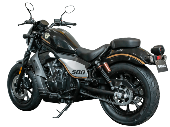 GROZA XS500 – великолепный лёгкий круизёр, идеальный как для езды по мегаполису, так и для поездок по загородным дорогам.Рядный двухцилиндровый четырёхтактный мотор объёмом 471 см3 выдаёт внушительные 48 л.с. и при высоких показателях динамики и отличном крутящем моменте способен разгонять аппарат до 160 км/ч. Инжекторный впрыск топлива с инжектором DELPHI увеличивает топливную экономичность, а также позволяет добиться высокой приёмистости и неприхотливости агрегата. Привод на ведущее колесо осуществляется с помощью цепи. Жидкостная система охлаждения не допустит перегрева мотора даже при самом агрессивном вождении.На аппарат установлена 6-ступенчатая механическая коробка передач с классической схемой “1-N-2-3-4-5-6”. Мотоцикл оснащён литыми алюминиевыми дисками диаметром 16 дюймов. С неровностями дороги эффективно справляются телескопическая вилка спереди и два газонаполненных амортизатора сзади. Задние амортизаторы являются регулируемыми, что обеспечивает лёгкую перестройку на различные режимы езды. Эффективное и безопасное замедление с любых скоростей обеспечивают гидравлические дисковые тормоза с ABS спереди и сзади.Мотоцикл имеет множество привлекательных декоративных элементов в олдскул-стилистике, что делает его похожим на кастом-байк.XS500 сочетает в себе отличные технические характеристики, комфорт и надёжность, что позволяет вам ощутить настоящую свободу на любой дороге.