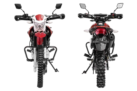Regulmoto SK 200GY-5 – мотоцикл двойного назначения, созданный для эксплуатации как на дорогах общего пользования, так и на легком бездорожье. Топовая модель линейки лайт-эндуро мототехники известного китайского производителя Senke отличается высокой надежностью повседневной эксплуатации, отсутствием сложностей в сервисном обслуживании, простотой и легкостью управления.В надежной раме с защитными дугами Regulmoto SK 200GY-5 установлен 4-тактный одноцилиндровый двигатель с рабочим объемов в 20 см3, демонстрирующий максимальную мощность в 13.6 л.с. Мотор с воздушным охлаждением, в котором можно без труда признать реплику двигателя известного японского производителя, оснащается балансировочным валом, что позволяет избавиться от излишней вибрации.Подвеска мотоцикла на колесах 21/18 дюймов со стальными ободьями представлена телескопической вилкой-перевертышем спереди, перья которой закрыты защитой, и стальным маятником с моноамортизатором сзади. Тормоза у мотоцикла дисковые, спереди установлен 4-поршневой суппорт, сзади – 2-поршневой.Оснащение Regulmoto SK 200GY-5 соответствует возлагаемым на мотоцикл эксплуатационным задачам: на байке вполне комфортно передвигаться по дорогам и легкому бездорожью, чему способствуют достаточно большой ход амортизаторов, защита цепи, пластиковая защита рук. Среди установленного оборудования присутствуют: аналоговая приборная панель, замок зажигания с защитой от попадания песка и пыли, полный комплект светового оборудования с дополнительными светодиодными поворотниками, встроенными в боковые обтекатели, зеркала заднего вида, стояночная и центральная подножки.Данная модель мотоцикла присутствует на отечественном рынке мототехники уже достаточно длительное время, за которое мотоцикл зарекомендовал себя легким в эксплуатации и неприхотливым в обслуживании аппаратом. О высокой надежности мотоцикла говорят солидный километраж пробегов при отсутствии серьезных неисправностей и позитивные отзывы обладателей Regulmoto SK 200GY-5.У нас Вы можете купить этот мотоцикл с бесплатной доставкой по РФ и гарантией до года. Также его можно приобрести в рассрочку или в кредит.