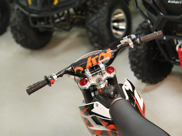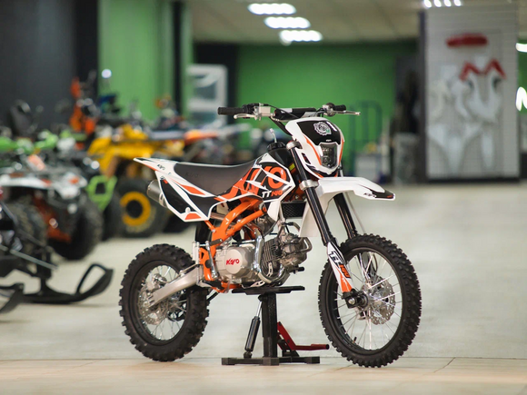 Питбайк KAYO Basic TT140 KRZ – версия для прогрессирующих и хороший старт для тех, кто готов перейти от базовых тренировок к более сложным заездам. Подходит для лёгкого эндуро и оттачивания мастерства.Одноцилиндровый 4-тактный двигатель воздушно-масляного охлаждения YX1P56FMJ объёмом 140 см3, выдаёт 13 л.с. Карбюратор NIBBI PE19 обеспечивает бесперебойную работу техники в самых жёстких условиях эксплуатации, простоту и лёгкость в обслуживании, а также неприхотливость к качеству топлива. Питбайк имеет вместительный топливный бак на 5,5 л. Питбайк оснащён механической 4-ступенчатой коробкой передач с формулой “N-1-2-3-4”. Запуск двигателя осуществляется с помощью рычага кикстартера.Мотоцикл имеет вес всего 73 кг. Усиленная рама из хром-молибденового сплава и подвеска позволяют эффективно амортизировать удары при езде по неровностям и препятствиям на трассе. Передняя подвеска — телескопическая вилка перевёрнутого типа длиной 770 мм, задняя — моноамортизатор длиной 360 мм. Оба компонента подвески являются нерегулируемыми. Рама и пластик являются собственной разработкой производителя. Мотоцикл оснащён классическими стальными спицованными колёсами диаметром 17 дюймов спереди и 14 дюймов сзади. Эффективное и безопасное замедление с любых скоростей обеспечивают гидравлические дисковые тормоза. Высококачественная износостойкая резина с развитым протектором отлично держит дорогу на различных типах покрытия.Питбайк оснащён яркой светодиодной линзованной фарой, позволяющей кататься в тёмное время суток.Если вы ищете послушный, компактный, динамичный и красивый питбайк, считайте, что вы его нашли. Это один из лучших мотоциклов для обучения и первых шагов в эндуро и мотокроссе. Он отлично подойдёт как для гонок на трассе, так и для обычного катания по пересечённой местности.