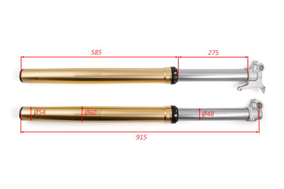 • Перья вилки для полноразмерных эндуро мотоциклов с шасси К8. Длина 910 мм, диаметр пера 48 мм. Однокартриджная конструкция с регулировками сжатия и отбоя. Имеют клапан для сброса воздуха и крепление под суппорт типа KTM. Выполнены в бронзовом цвете.
