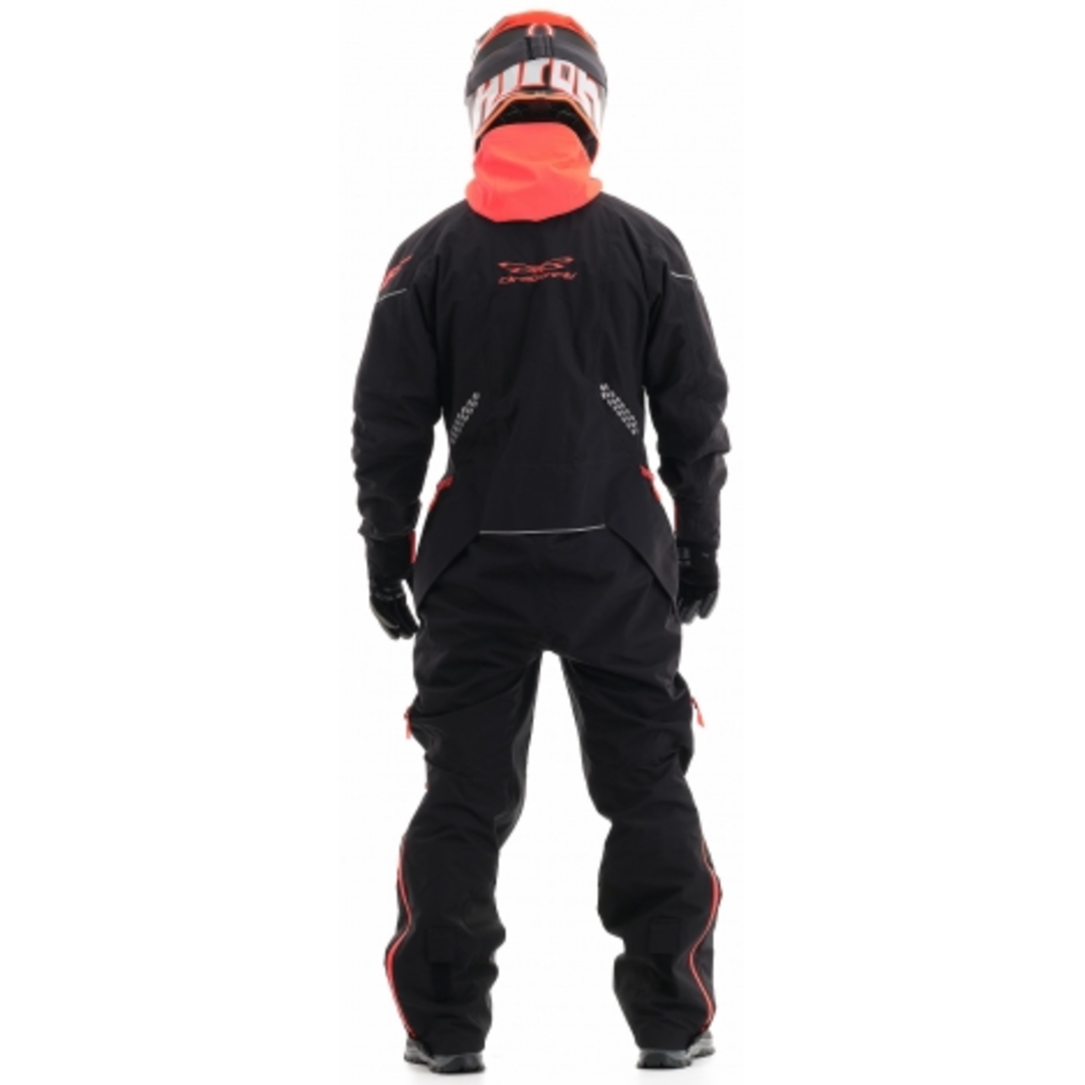 Комбинезон предназначен для снегохода и сноубайка. Надежно защитит от ледяного ветра и мокрого снега. Ткань верха дополнительно содержит тефлоновое водоотталкивающее покрытие. Внешние молнии влагозащитные. Проклеены все швы. На рукавах есть эластичные манжеты, на штанинах снегозащитные юбки с петлёй для фиксации к ботинкам. При закрытой вентиляции и карманах комбинезон герметичен.Функционал комбинезона тщательно продуман и зарекомендовал себя среди снегоходчиков и сноубайкеров. Светоотражающие элементы есть со всех сторон. Семь карманов покрывают все потребности райдера, в том числе для ски-паса, телефона, и теплые, для согревания рук. Есть удобная петля под тангенту рации и кольцо D-ring для ключа горного снегохода. Центральная молнии с тремя замками: открывается сверху и снизу. Несъемный капюшон с двойной утяжкой. Для удобства приема пищи и воды во время стоянки – есть расширения на воротнике, защищает от ветра в расстёгнутом виде. В помещении можно снять верхнюю часть комбинезона и воспользоваться регулируемыми лямками - подтяжками.